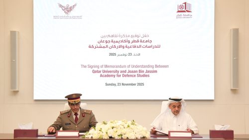 وقعت أكاديمية جوعان بن جاسم للدراسات الدفاعية، ممثلة بالعميد الركن (دكتور) راجح محمد النابت رئيس الأكاديمية، مذكرة تفاهم مع جامعة قطر، ممثلة بسعادة الدكتور عمر