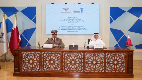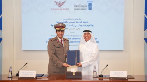 وقعت أكاديمية جوعان بن جاسم للدراسات الدفاعية، ممثلة بالعميد الركن (دكتور) راجح محمد النابت رئيس الأكاديمية، مذكرة تفاهم استراتيجية مع جامعة الدوحة للعلوم والتكنولوجيا، ممثلة بسعادة الدكتور سالم بن ناصر النعيمي رئيس الجامعة.